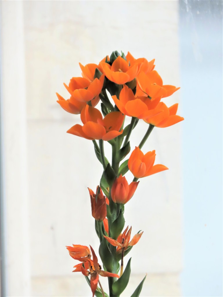 Deze bloem is de overlever van een troepje van zes. Ik word er blij van. Van de warme dieporanje kleur, de sensuele blaadjes, de harmonie van meeldraadjes en stampers. De frivole finesse van dat alles, en in dit geval: de belofte van nog meer ontluikende schoonheid. Zelfs de verwelkte bloemetjes halfweg de stengel stelen mijn hart. De liefde lijkt wederzijds.