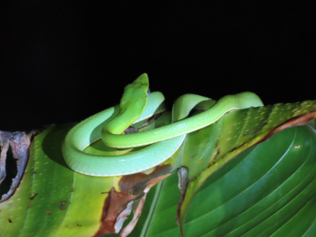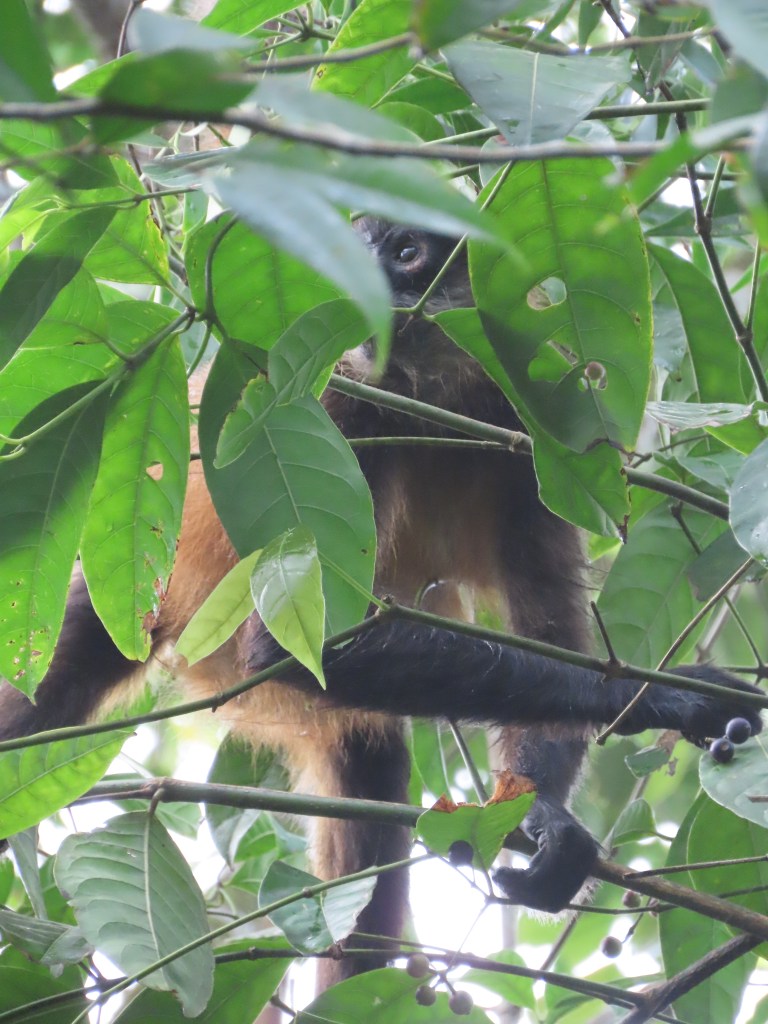 Gran Terminal del Caribe in San José, bus naar Cariari. Overstappen op een oude Amerikaanse bus richting La Pavona. Full speed over de rivier naar Tortuguero – bekend van de schildpadden, maar ik zag er alleen overblijfselen. Misschien verorberd door een jaguar? Dat dier vertoeft in het nationaal park en durft zich al eens aan de uiterwaarden van het dorp te vertonen, er is een Calle del Jaguar en enkele lokale mensen toonden me filmpjes. Het is donderdag, ik verblijf bij Katia en Oscar. Overal luide, goede, tropische muziek. Ik zie voor het eerst de Carribische zee, het strand is bezaaid met wrakhout. Etentje bij Dona Maria, de eerste rijst met bonen (casado) in een lange reeks. Op vrijdag geniet ik van de krabbetjes in de tuin en het schouwspel van de spider monkeys die je dankzij het schuddende gebladerte al van ver het dorp ziet naderen – ze komen fourageren bij de buren. ’s Avonds een night walk met Rubier in het gezelschap van Walter en Olivier, twee (beren van) neven uit Montpellier. We zien een slangetje, spinnen, een opossum, kikkers, verschillende luiaards, een sperwer. Mooie oogst. Het eten nadien – bij Soda d’Leite – is lekker: een hele bordvullende Robalo, een vlezige zeebaars. Walter bestelt ook enkele lekkere hapjes. De dronken taferelen die we nadien in La Taberna aanschouwen zijn niet van die aard om er lang te blijven.