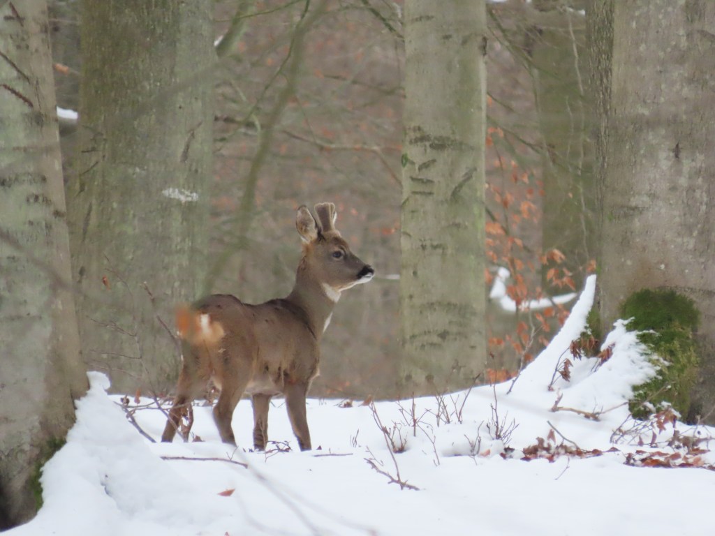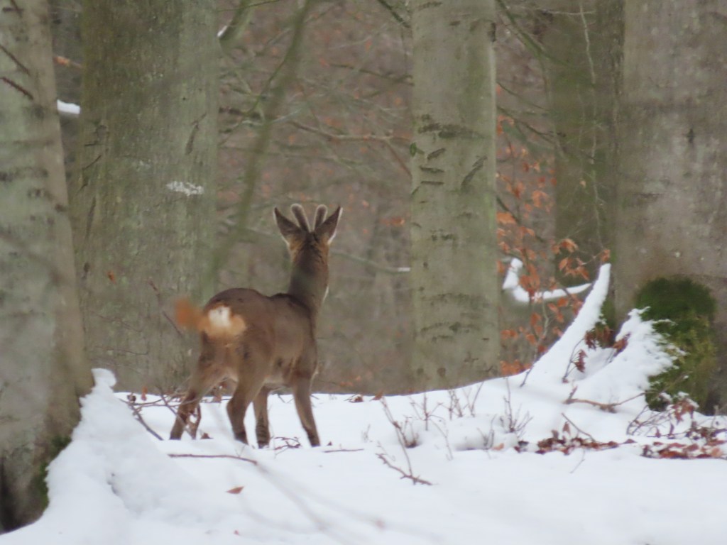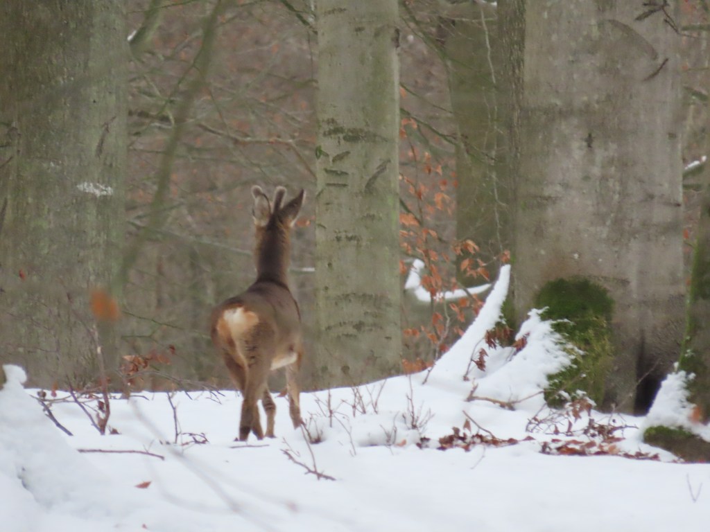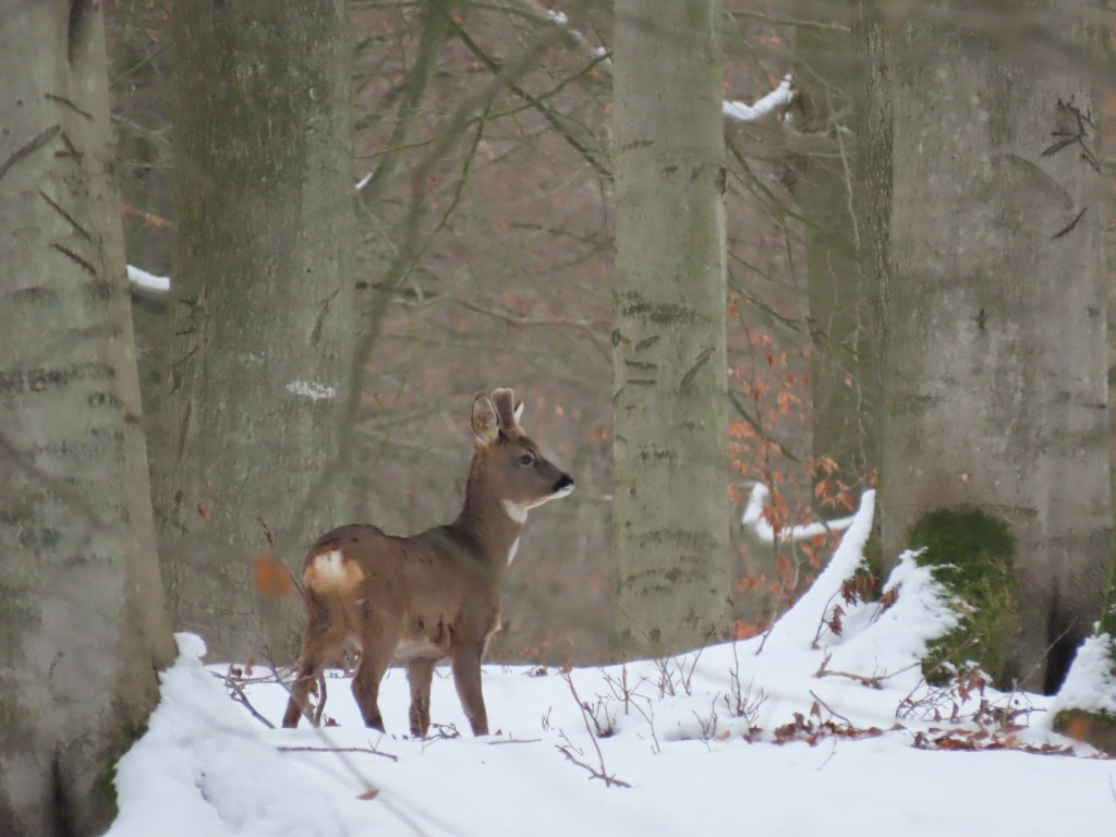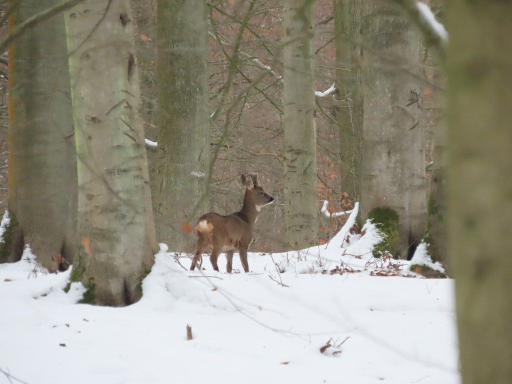 Deze ochtend stond ik dan ook bij de laatste vriestemperaturen (hopelijk niet van de hele winter) al voor het ochtendgloren in het woud. Binnen enkele dagen is de sneeuw waarschijnlijk helemaal weg. Het was magisch om in het schemerdonker omringd te zijn door de sneeuw, 360° – wat me een heel aangename sensatie bezorgde, alsof je echt rondloopt in een sprookjesdecor of in een andere dimensie. De vogeltjes ontwaakten, en ja hoor: na een halfuurtje zag ik een reetje op zo’n 40 meter afstand – verscholen achter een omgevallen boom. Maar zij had me ook gezien en samen met haar kompaan vloog ze de heuvel op – zo snel heb ik ze eigenlijk nog nooit geweten. Niks geen stramme spieren van de kou, geen voorbehoud bij de aan het zicht onttrokken ondergrond, neen: als een pijl uit een boog. Het was mooi om zien, die kracht, die jeugdigheid naar ik vermoed. Even later, in het voornoemde Zwaenepoel, zag ik onderstaande rakker staan: hij stond een beetje voor zich uit te staren, alsof hij zich afvroeg of het weer ging veranderen – als een boer op zijn akker. Ik genoot er immens van om hem daar zo rustig, dromerig, voor zich uitstarend te zien staan … Op de foto’s viel me op wat voor een korte, stevige knaap het lijkt – goeddoorvoed. Die nogal gedrongen gestalte is natuurlijk te wijten aan de minimaal vijf centimeter dikke sneeuwlaag, waarschijnlijk nog iets meer, die de ranke maar stevige onderbenen aan het zicht onttrekt.