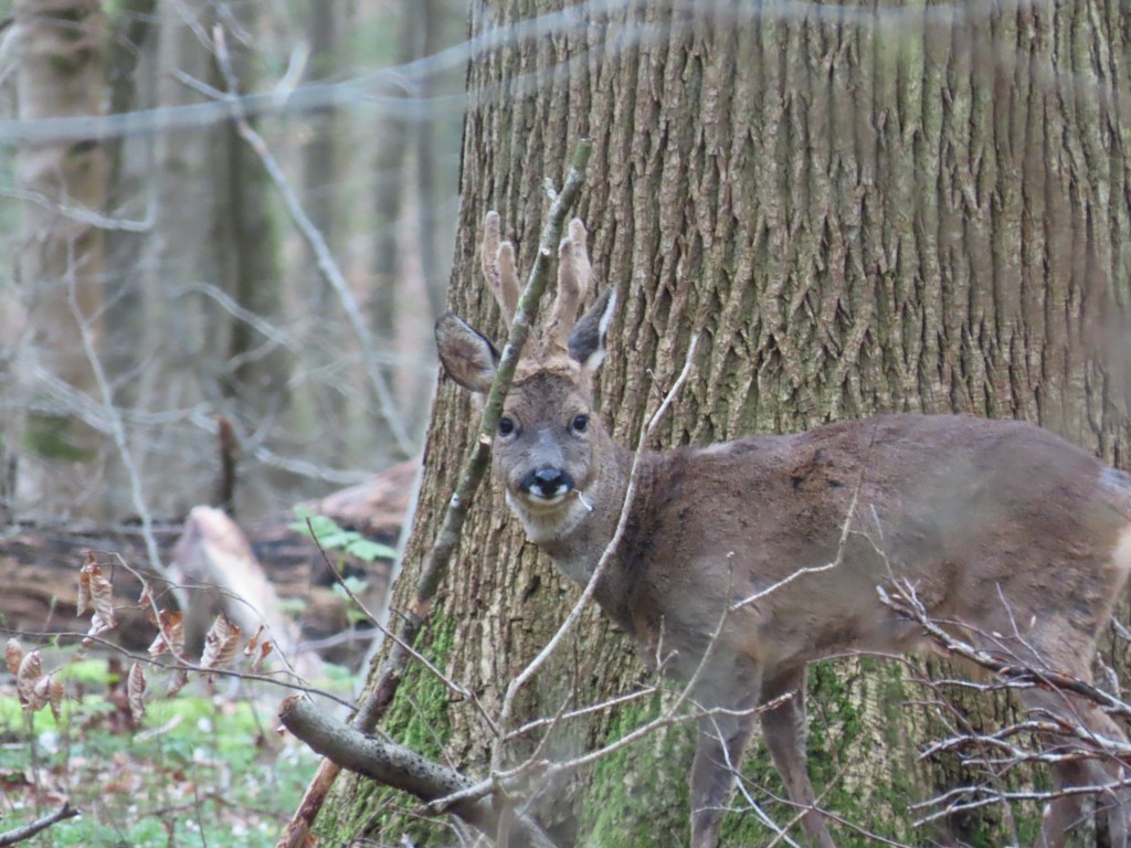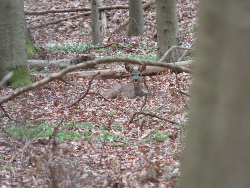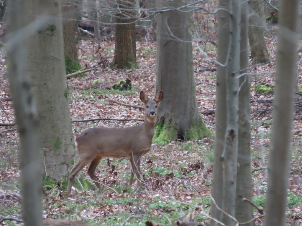 Ik zie ze bij toeval. Twee reetjes op vijftig meter. Ik begin erop te letten, begin er andere te zien langsheen dezelfde weg. Een snelle, fladderende beweging: de flapperende oren van een liggend reetje. Tot mijn opluchting staat ze op – moeizaam, breekbaar, dat wel. Maar het hondengeblaf dat ik een kwartier vroeger hoorde heeft haar dus niet tot slachtoffer gemaakt. Ik zie nog andere reetjes dwalen in de verte. Vraag me af wat ze met hun mooie snuiten tussen die grijsbruine bodemlaag zitten te zoeken. Waarom niet dat verse groen dat je hier en daar ziet verschijnen? Vanop afstand zien ze er schriel, ondervoed uit. Ik eet mijn boterham, drink mijn water, vervolg mijn pad. Opeens een kloeke reebok links van mij – hij weet dat ik geen gevaar ben, de ervaring spreekt. Ineens hoort hij iets – spitst de oren, trekt wat moeizaam op gang maar gaat er dan toch vandoor. Met een gelukzalige glimlach wandel ik doorheen het bos terug richting bushalte. Ik zet me even op een van de weinige banken die er zijn. Terwijl ik de foto’s bekijk verschijnt er ineens uit het niets een reetje zo’n vijftien meter voor mij. Wat een mooi dier. Ze houdt even halt op het bospad – ik kan haar niet goed zien maar bedenk hoe slim ze wel moet zijn. Ik druk af. Ze springt haar dag tegemoet. Gedachteloos vervolg ik mijn weg.