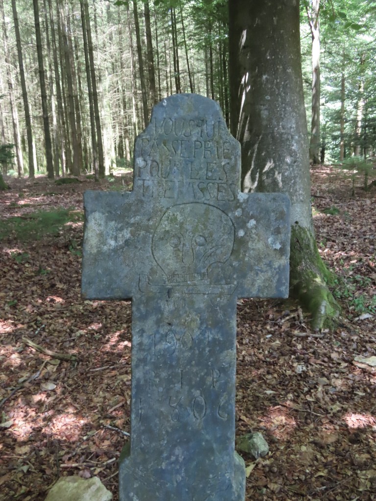 De gedenksteen is ronduit akelig. Ditmaal valt het mee. Het is een mooie, zonnige dag – de dood hangt niet in mijn gedachten. Maar toch: welk een macaber idee om hier de reiziger te vragen stil te staan bij zij die zijn heengegaan. Er staan twee jaartallen op. 1901 en 1806. Wat betekenen die jaartallen? Wie waren die mensen? En hoe zijn ze aan hun einde gekomen? Was het hier? In de buurt? 1806, het lijkt een eeuwigheid geleden. Zou de steen al zo oud zijn? Het is perfect mogelijk – enkele kilometers verder staat er een prachtig kapelletje uit de veertiende eeuw. Het afgebeelde gezicht is natuurlijk wat deze steen zo luguber maakt. Het lijkt een kindertekening. Maar dan wel eentje uit een boek van Stephen King. Dat mes ter hoogte van de keel. Of wordt het tussen de tanden geklemd? Het vileine litteken op de linkerwang. Onwillekeurig draai ik me om. Scan de omgeving. 1806 lijkt me veel te nabij.