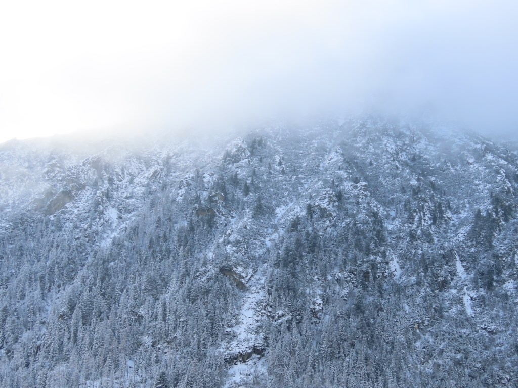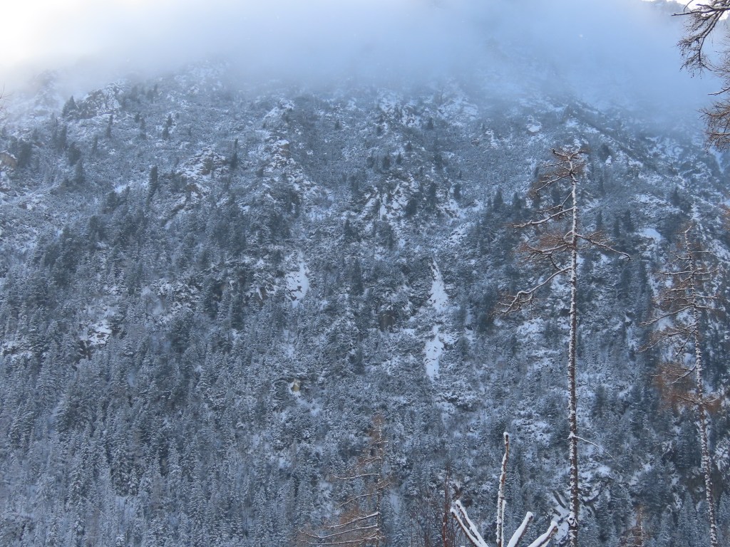 Misschien presenteert het niet perfect op deze website. Misschien is het moeilijk uit te leggen waarom deze beelden mij zo gelukkig maken (de textuur, de patronen, de kleurschakering). Maar wie weet kijk je naar de foto’s en heb je alles meteen begrepen. De borsteligheid van de setting. Een ruw landschap getooid in een sneeuwlaagje. Niet ondoordringbaar, maar ook niet alledaags. Ijskoude lucht. De setting feeëriek bij een zonnestraal, levensbedreigend wanneer de wolken vanuit het niets opdoemen. Ik neem foto’s om later nauwkeuriger te kunnen kijken. Te zien of er geen gems of lynx verscholen zit in dit verhaal. Een bruine beer misschien. Het is tenslotte hun biotoop.